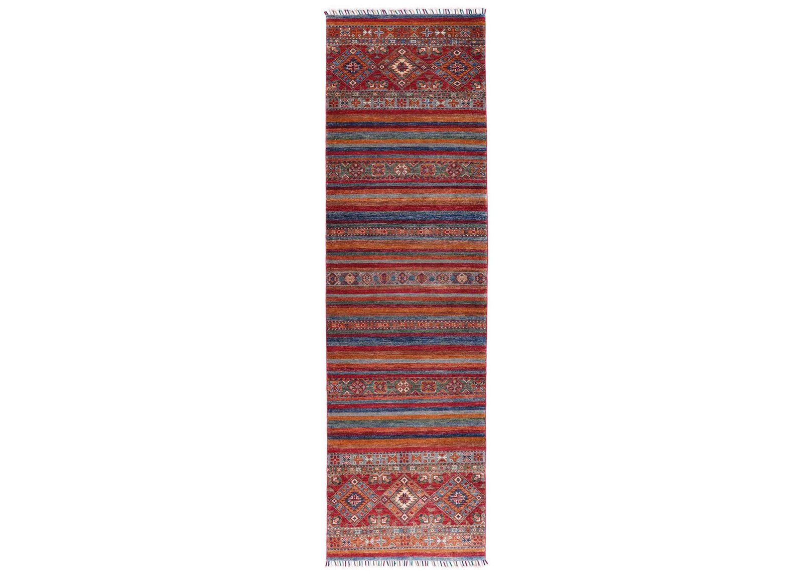 Choose the Horcun Stripped Hand Knotted Wool Runner Rug 9.7×2.7 ft Red-Rainbow from Rugs Turkey to elevate your space with elegance and quality.