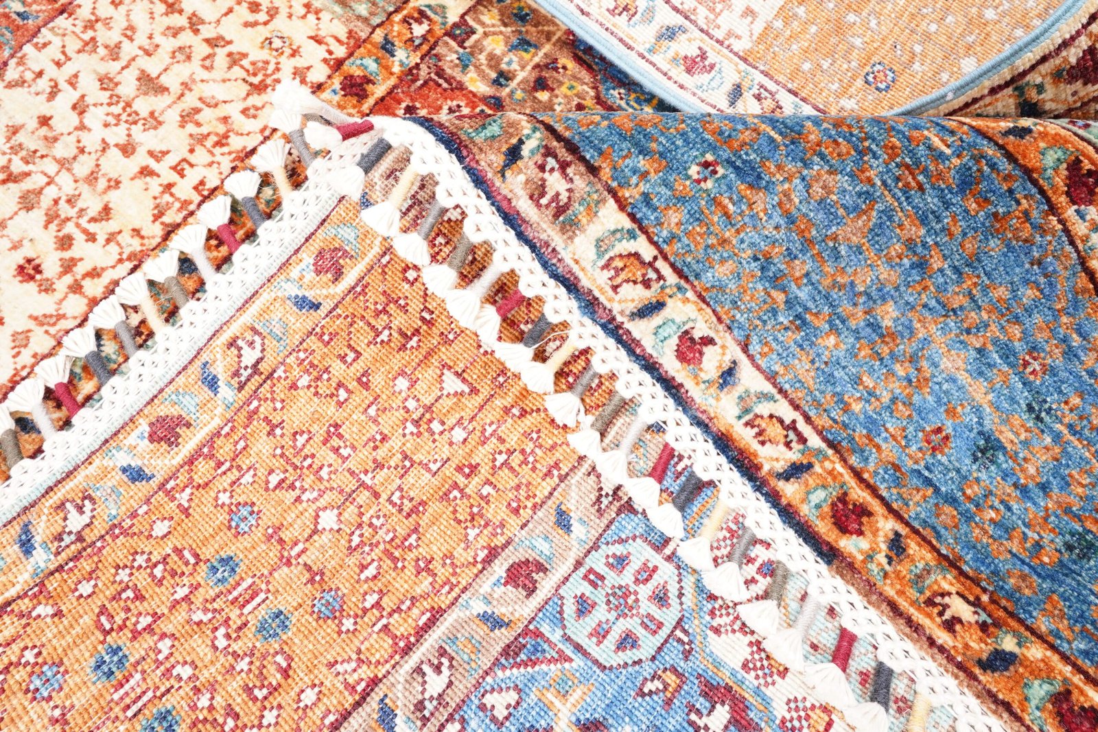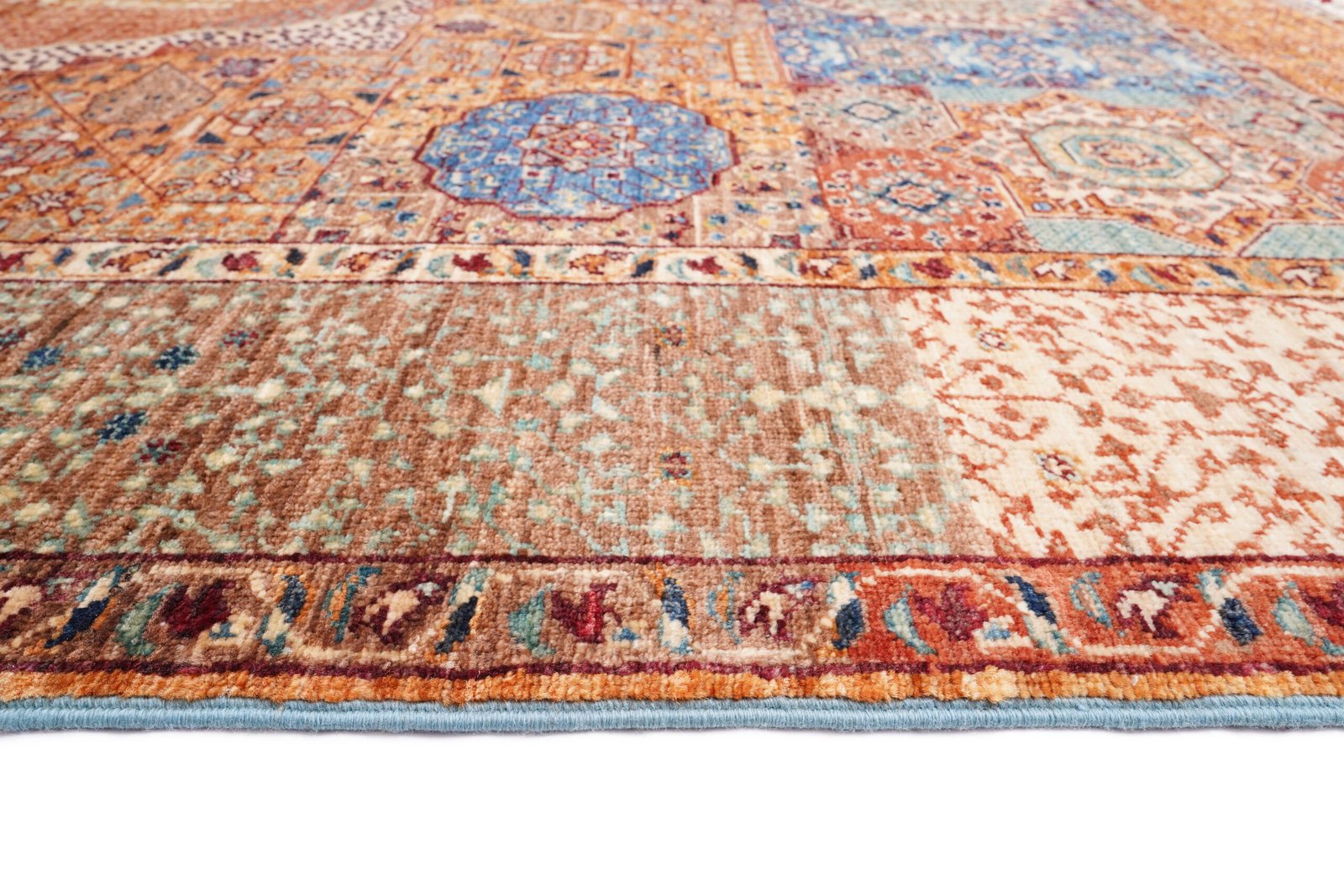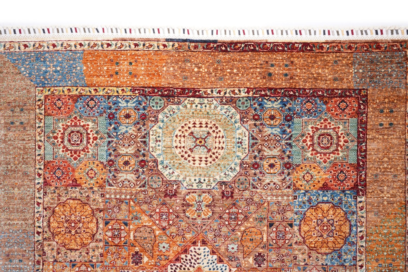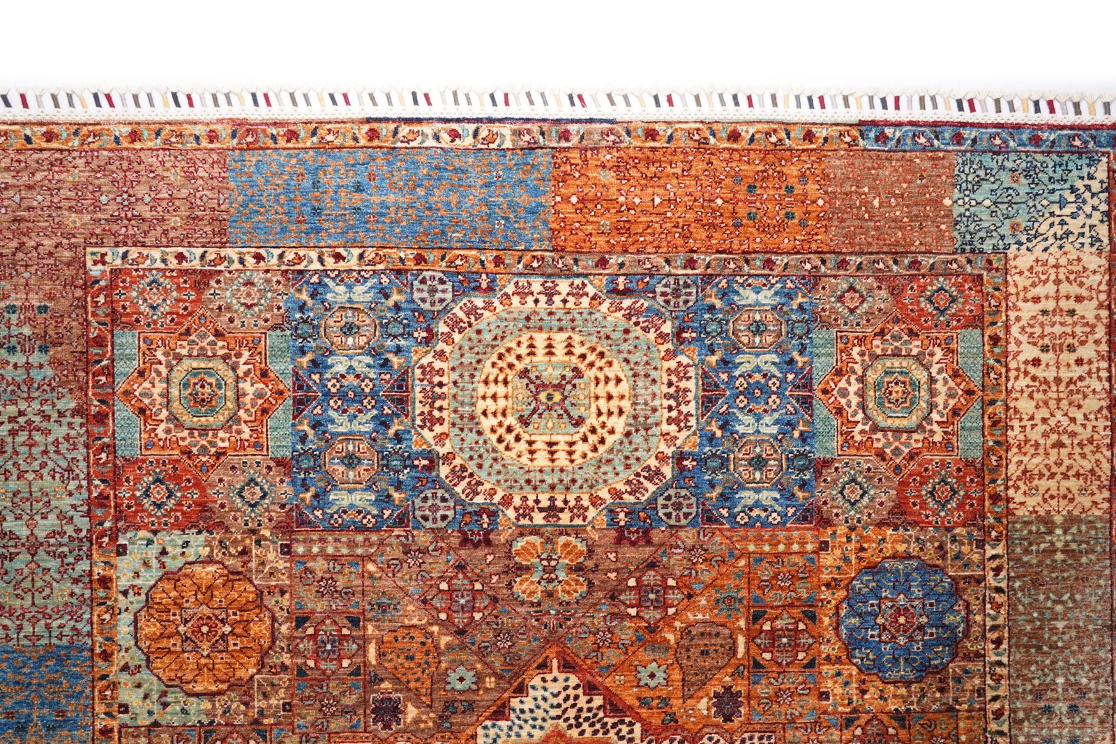 Enrich your living space with this striking hand-knotted Afghan rug in a traditional Memluk design. Featuring a vivid blend of orange and blue tones, this medium-sized piece blends rustic charm with artisanal elegance. Crafted from upcycled wool on a durable cotton base, it offers a sustainable and visually captivating flooring solution.