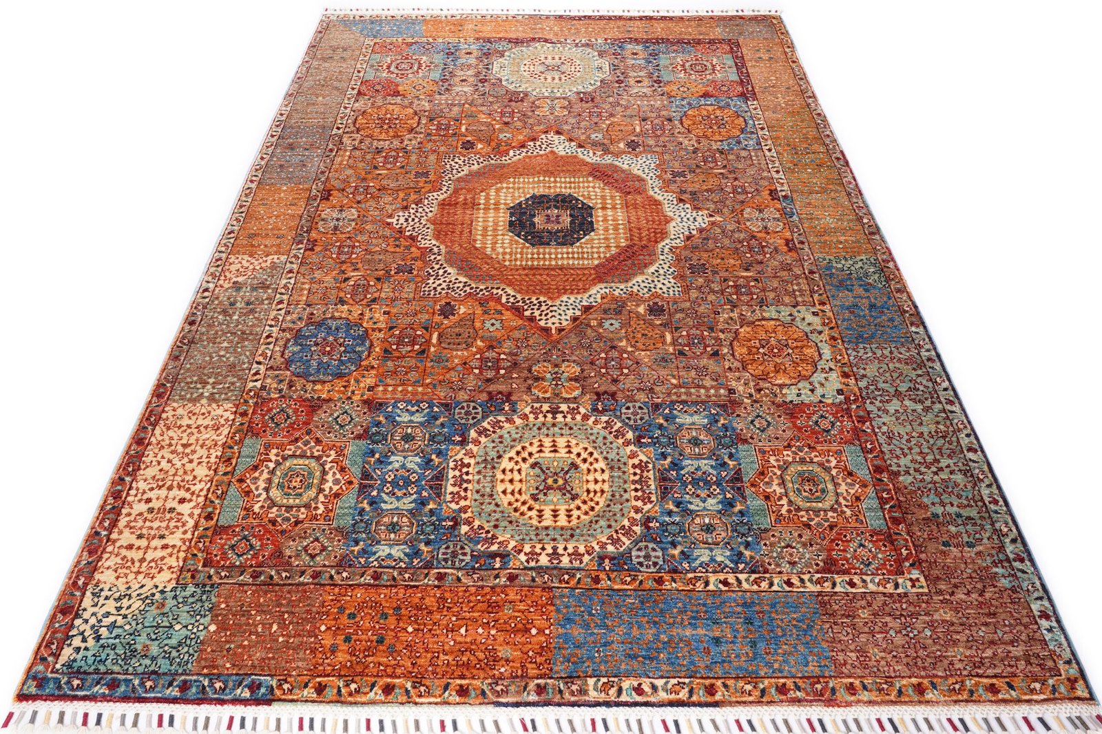 The Orange & Blue Hand-Knotted Afghan Rug – Wool Memluk Geometric Design is a celebration of color, craftsmanship, and culture. A standout addition to any thoughtfully curated home.