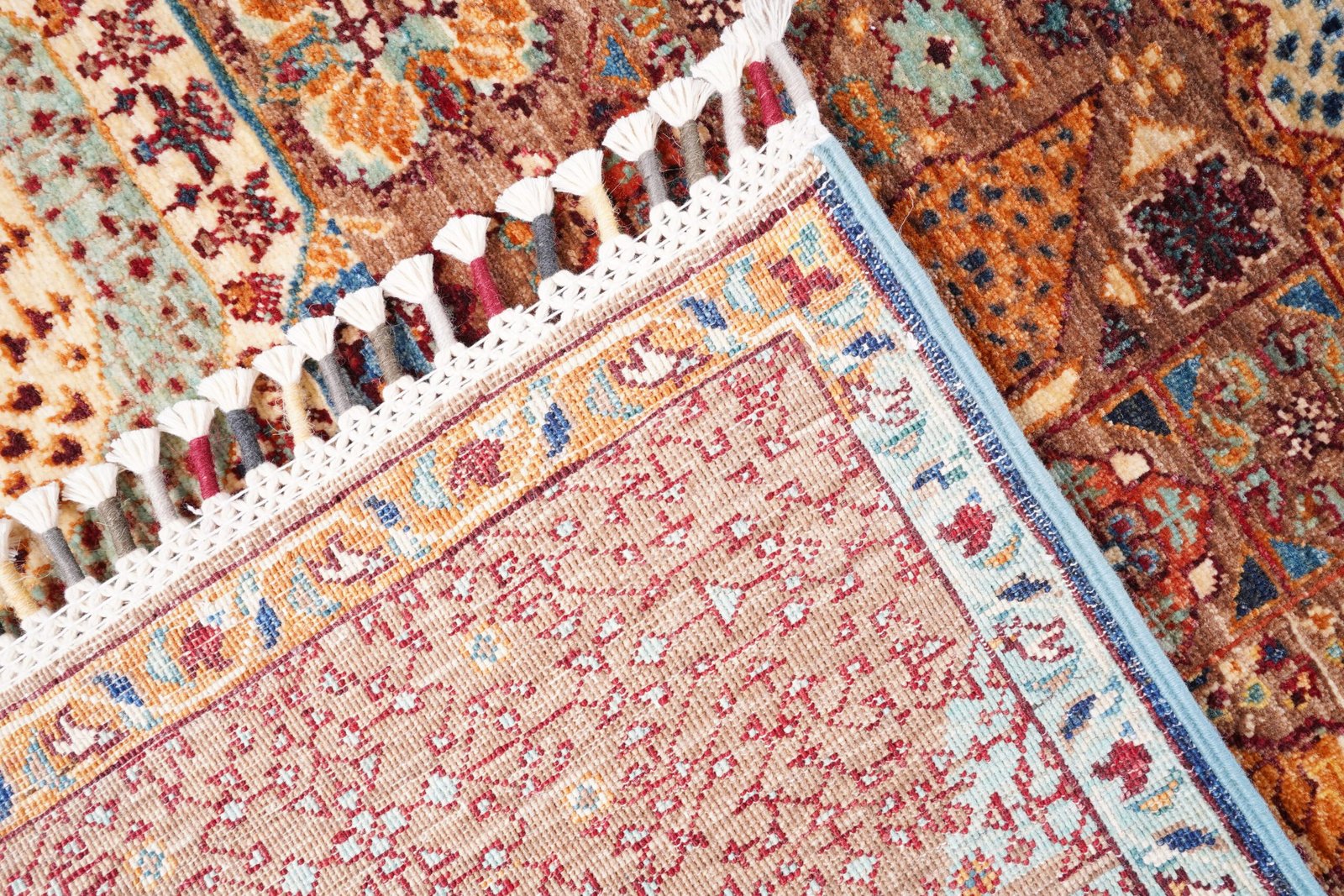 Each rug is meticulously hand-knotted by skilled Afghan artisans using upcycled wool and a cotton foundation. This sustainable process ensures durability while preserving ancient craftsmanship traditions.
